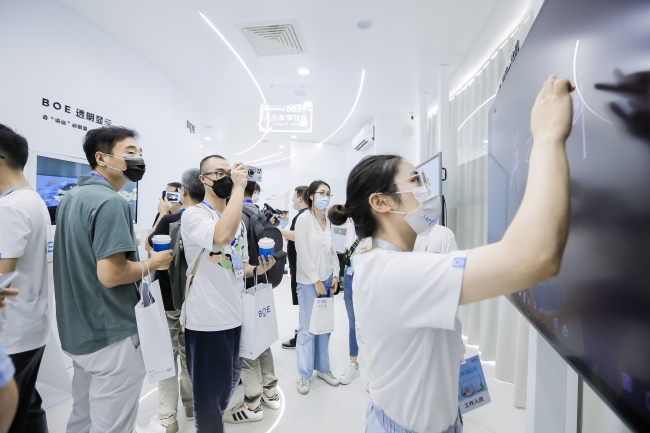 来到智能家居体验区,参观者只需“躺”在床上,触发枕头上的压力感应装置,便可通过49英寸ADS无界拼接大屏,让你的卧室幻化出星空云海、宇宙银河、热带雨林等场景,让参观者仿若置身于梦境之中。在智慧健康体验区,通过参与传感搏击游戏,参观者可实时在超高清大屏上获取速度、力度等健康数据,同时投影互动墙还全面展示了BOE(京东方)基于个人健康管理、社区卫生服务和数字医院诊疗的全方位全周期健康管理平台。在智慧交通体验区,采用透明OLED显示的“智能炫窗”集显示与调光于一体,让人们在旅途中可随时进行观影娱乐、调光遮阳等功能的切换。最近,智能炫窗系列产品还应用在了我国首创的全球最高时速600公里磁悬浮列车上。在智慧办公体验区,BOE(京东方)全新推出的5376超高分区Mini LED背光智慧一体机分外亮眼,通过融合十大AI创新科技,无缝切换办公、会议、绘画三大场景,为人们带来智慧高效的全新办公体验。在智慧文博体验区,采用类纸护眼显示技术的BOE画屏,让电子屏幕像纸张一样呈现世界名画的细腻笔触与真实质感,并且兼具绿色健康的视觉体验,搭配后台智能互动程序,让艺术品重新“活”了起来,带来一场穿越时空的奇妙邂逅。展馆出口处还采用LED全景式屏幕搭建了裸眼3D沉浸式空间,参观者可以在这里写下寄语和祝福,留下专属的美好记忆。
