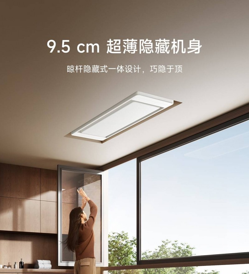 米家智能晾衣机2Pro拥有突破行业常规的9.5cm超薄一体化机身,比竞品平均10-13cm的机身更显轻盈,完美融入现代家居风格,犹如天花板上的艺术品。无论是小户型的紧凑阳台,还是大平层的奢阔空间,皆能以极简设计勾勒高级感。