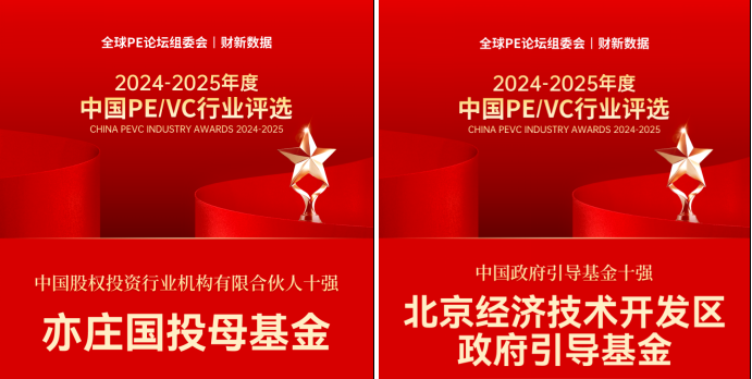 同日,由全球PE论坛组委会和财新数据主办的2024-2025年度中国PE/VC行业评选结果重磅发布。亦庄国投母基金凭借卓越表现成功入选“中国股权投资行业机构有限合伙人十强”,亦庄国投管理的北京经济技术开发区政府引导基金也同步斩获“中国政府引导基金十强”殊荣。
