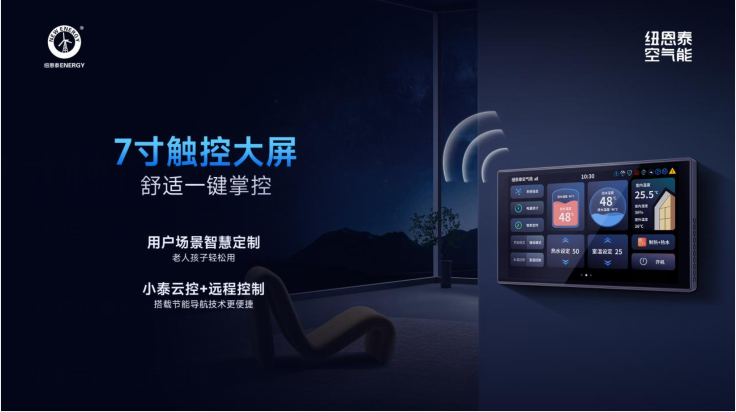 管理的便捷性,是高端系统不可或缺的一环。纽恩泰T+智擎Pro·变频三联供配备了7英寸的智能触控大屏,中文界面直观清晰,家中长辈和孩子都能轻松上手操作。更重要的是,它支持小程序小泰云控+远程控制,身在外地也可提前设置家中温度,预约热水,查看能耗,实现全屋冷暖的智控体验,让舒适更进一步。
