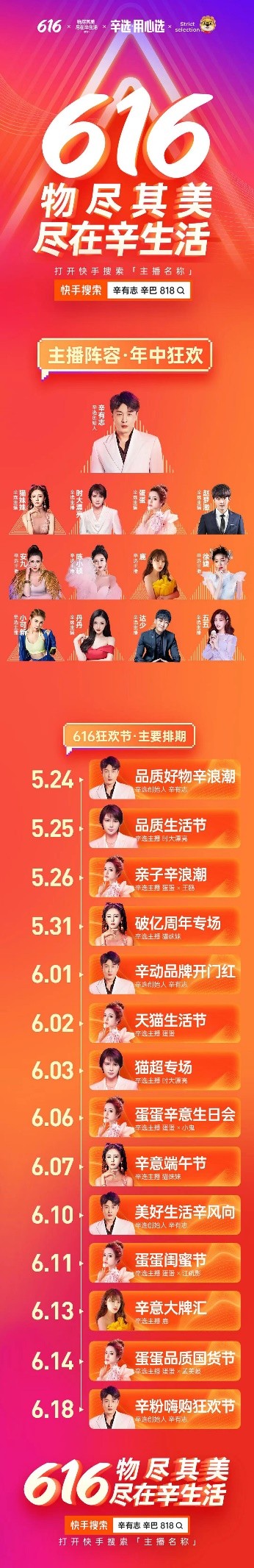 这些辛选供应链的变革也在此次年中大促的排期上得到了体现。此次辛选616购物节的主题为“物尽其美,尽在辛生活”,时间从5月24日一直持续到6月20日。辛巴辛有志在5月24日的这场直播,是辛选年中大促的首场直播,后续辛选各大头部主播和新孵化的中腰部主播将陆续开播,将给快手新主流消费用户带来大牌明星专场、国潮专场、产业带专场、品质国货专场、海外奢品专场等几十场主题直播活动。