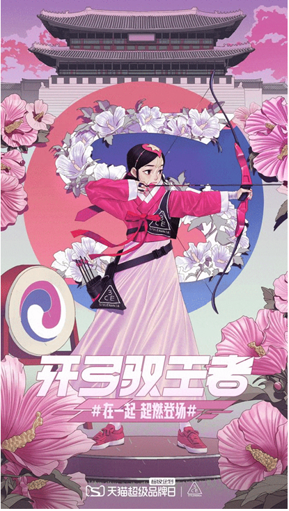 天猫超级品牌日集齐了16个超级品牌进行了一场超级企划,海报设计精美,并且加入了各国的文化元素,每张海报都配有一句简短而超燃的文案,非常刺激人们的视觉感官。