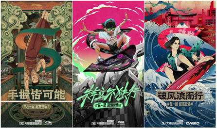 卡西欧的“破风浪而行”,画面上采用经典的浮世绘风格,选景上选取日本著名的富士山,主画面以海浪为主,诠释品牌“破风浪而行”的品牌寓意。