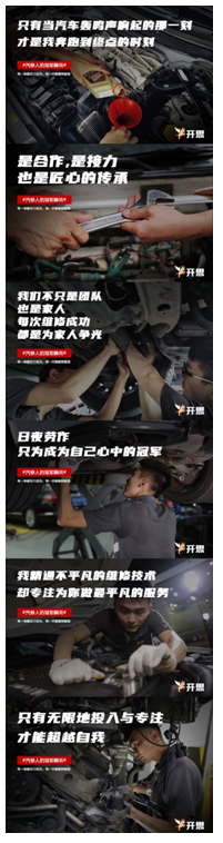 与上述借势海报不同,开思汽配的这组借势海报是以“汽修人”为主角。海报选用汽修人一个个专注、专业的瞬间,凸显“汽修人的冠军瞬间”。汽修人如奥运场上的运动员一样,专注、追求极致,汽修人又代表了一个个普通人,做着不普通的事,诠释出一个个普通人的“冠军瞬间”。