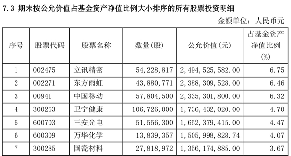 傅鹏博在中报指出:“一季度,重点公司配置出现了一些‘新面孔’,而食品饮料板块开始‘淡出’。二季度,针对化合物半导体材料、电动智能转型和电子雾化等投资机会做了重点布局。行业景气度和发展空间是我们研判的核心指标。从个股看,主要配置了快速成长、产业链上有明显竞争优势的公司。”