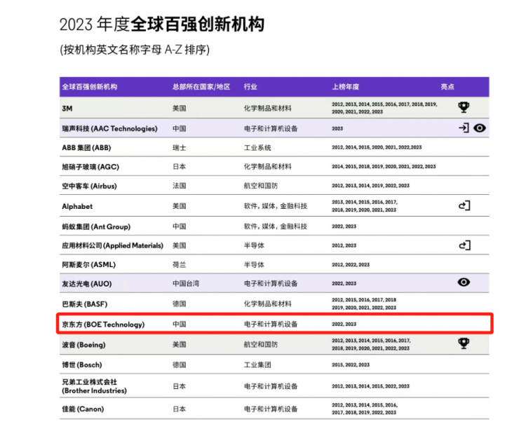 2月16日,全球领先的专业信息服务提供商科睿唯安揭晓“2023年度全球百强创新机构”榜单,BOE(京东方)继2022年首次上榜后再次入选,成为中国大陆四家上榜企业之一。该榜单着眼于企业持续的卓越创新能力,依据德温特世界专利索引和德温特专利引文索引,从发明专利的数量、影响力、全球化程度和技术独特性等维度进行评估,遴选出位于全球创新生态系统顶端的百强创新机构。BOE(京东方)作为第二次上榜“全球百强创新机构”榜单的企业,持续彰显出其作为行业龙头的创新实力和技术引领力,也成为BOE(京东方)迈向三十周年崭新征程的一份创新献礼。