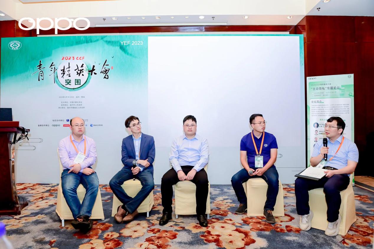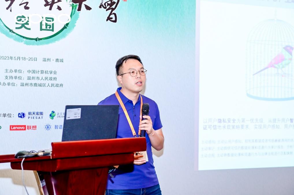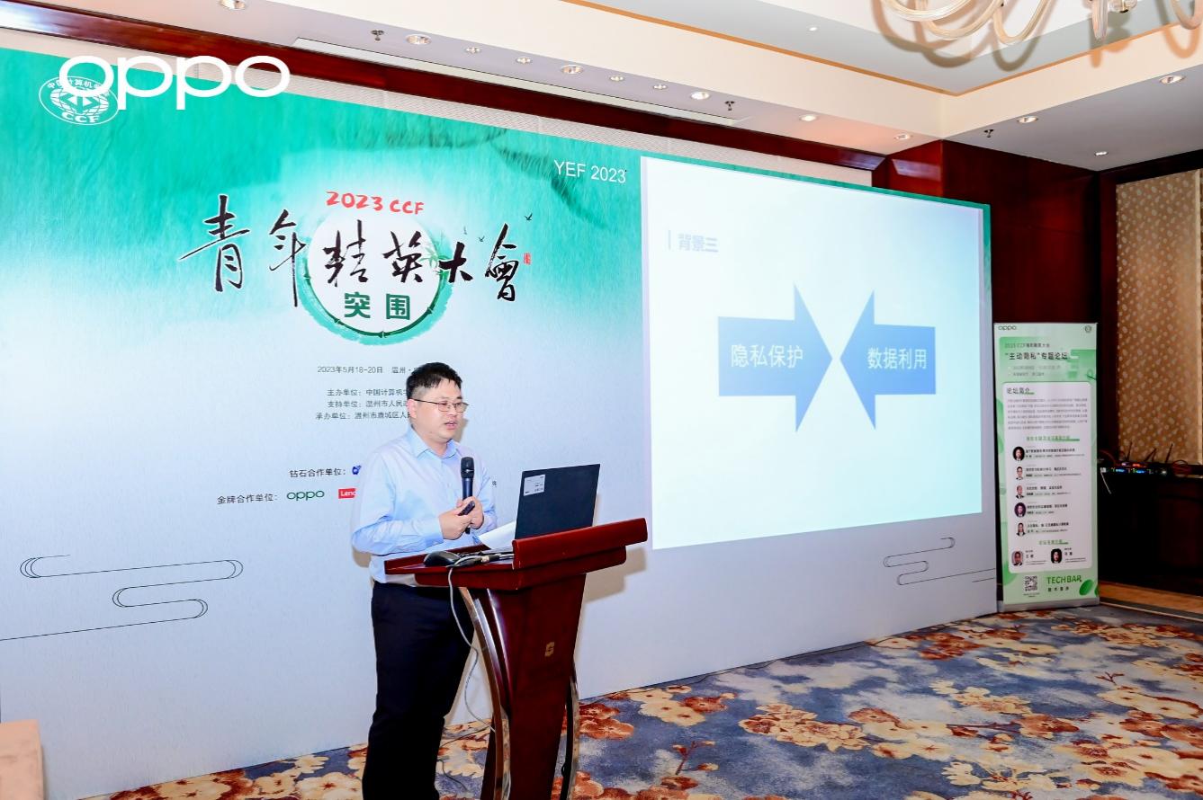 其中,“主动隐私”论坛旨在与学界、业界一起,共同探索主动隐私的内涵与发展,推动以用户隐私为中心的智能服务研发,让用户获得高效、高质量的智能服务的同时充分保护其隐私安全。论坛执行主席、OPPO研究院隐私计算实验室主任王俊致欢迎辞,论坛联合主席、上海交通大学副教授、数据法律研究中心执行主任何渊,浙江大学特聘研究员、现代服务创新实验室副主任陈超超,山东大学研究员、国家级青年类人才葛春鹏,南京理工大学副教授周俊龙,OPPO研究院高级隐私计算研究员孟丹分别从不同维度围绕主动隐私作主题报告,全方位展示了这一计算机前沿科技领域的现状和未来。