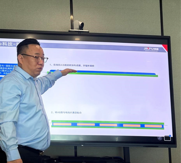 随后,孙思严先生代表锦富技术向对方介绍了光学胶黏剂应用于组件封装材料的性能特点。锦富技术自研的液态光学胶的传统应用领域为光电领域的触控屏幕行业,产品的应用场景及工况不仅包括了车载显示领域、大尺寸商显等领域,同时还包括了船用屏幕等高湿、高腐蚀的复杂工况。对于光伏行业较为关注的水汽渗透率及耐候性等多个指标都有显著性能优势。