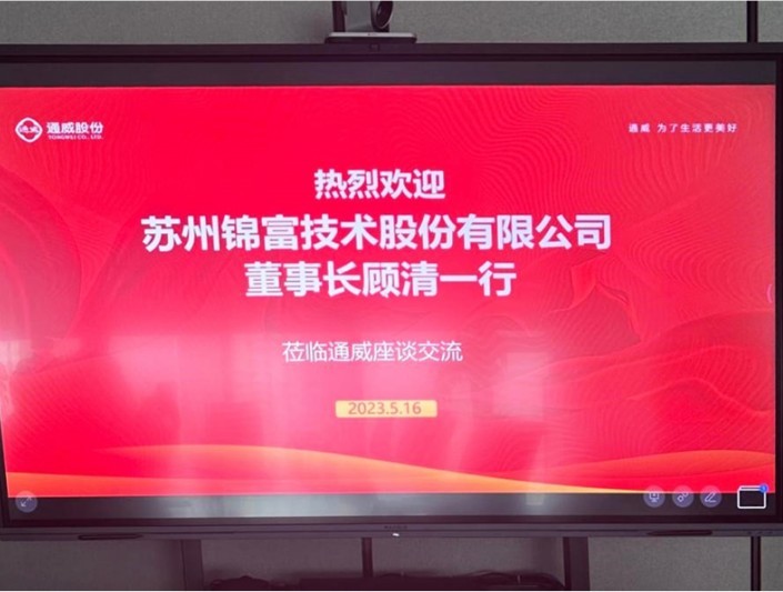 5月16日上午,锦富技术董事长顾清先生带队前往成都通威股份总部,与通威股份相关业务负责人及多名核心技术骨干沟通交流光伏组件贴合新路径,共同探索讨论光学液态胶替代传统封装材料降本可行性。