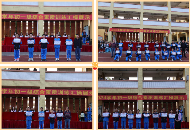 学校领导和家长代表为获得训练标兵称号的学生代表和获得优秀集体奖、标兵集体奖的班级颁发奖状。