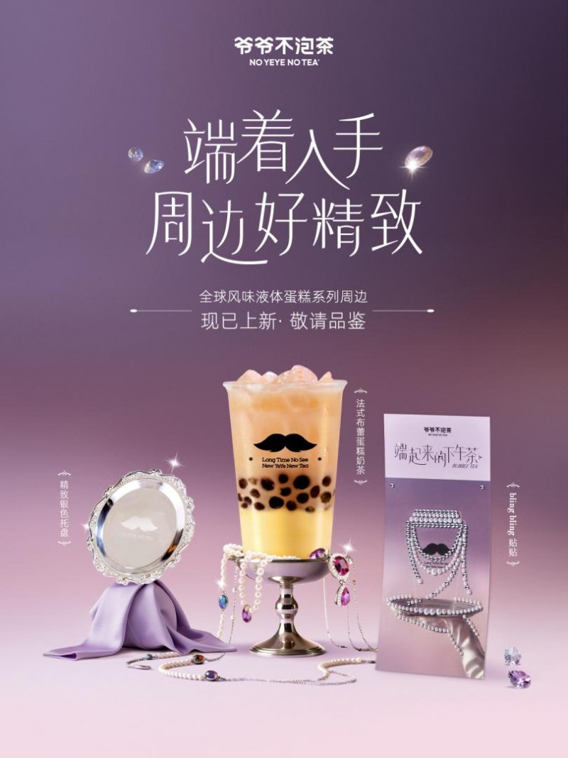 同时,爷爷不泡茶还推出了限定周边“blingbling贴贴”,让每一个奶茶杯都成为高级感拉满的珍珠奶茶杯,也可供消费者DIY装饰在手机、太阳镜等随身物品上,让下午茶带来的“端起来”的氛围感延续到门店之外。