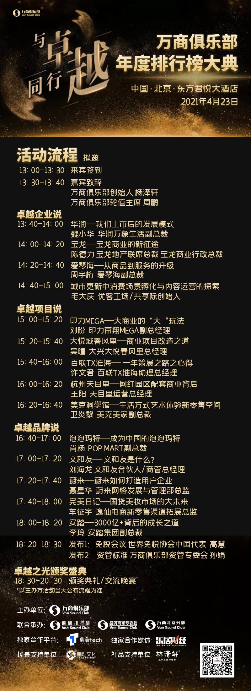 4月23日,万商俱乐部2021年度排行榜大典将在北京君悦大酒店举办,活动以“与卓越同行”为主题,打造“聆听卓越的声音”主题分享环节,邀请“年度排行榜”代表亲临现场,带来精彩的观点输出和干货分享,并发起“卓越之光”颁奖盛典暨交流晚宴,嘉勉行业标杆,搭建行业精英交流平台。