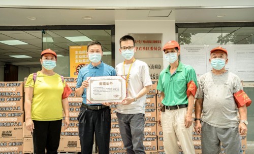 6月9日上午,海珠区仁厚直社区党群服务中心,最先接收本次捐赠行动的物资。海幢街平安促进会负责人陈润南主任主持了捐赠仪式。陈主任表示“团结做好社区防控工作,让广州这场疫情战斗尽快结束,离不开各方努力,协同支持一线抗疫人员”。