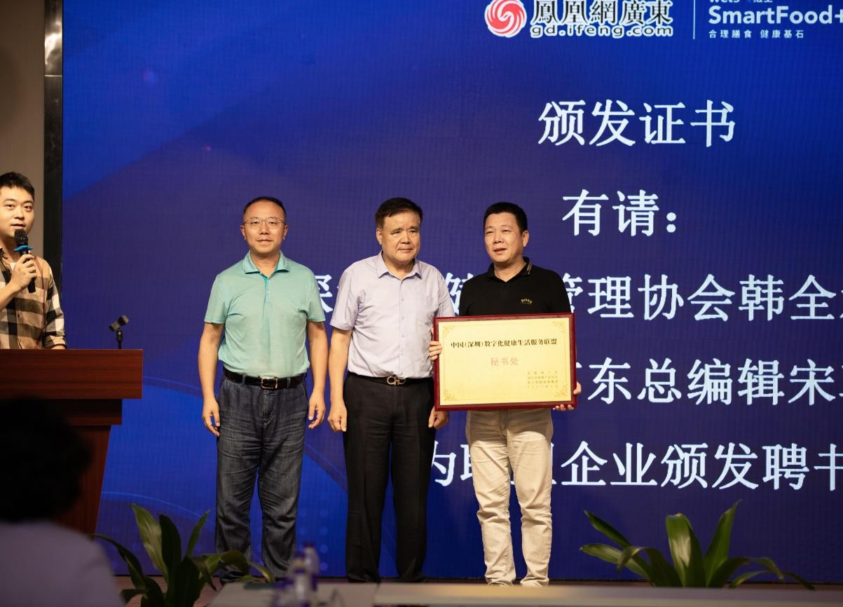 研讨会后,与会嘉宾在现场共同见证数字化健康生活服务联盟成立仪式。凤凰网广东总编辑宋革、深圳健康管理协会常务副秘书长韩全水为维士智慧健康管理(集团)颁发秘书处牌匾,为武志红心理、午安科技等首批联盟成员颁发证书,为深圳大学总医院主任医师李强、北京大学深圳医院主任医师张帆颁发智库聘书。