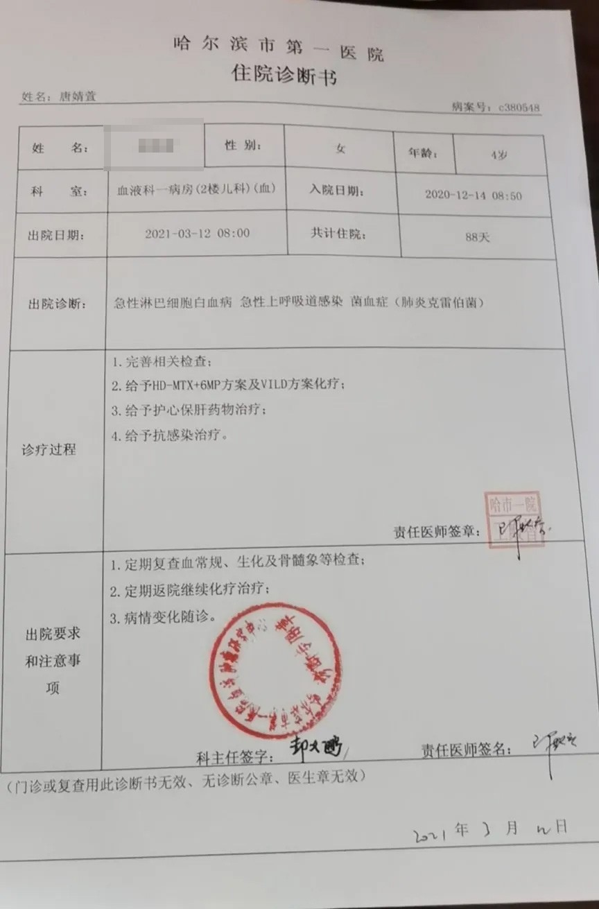 妈妈便只身带着女儿来到北京,在北京儿童医院检查后,初步诊断为急性淋巴细胞白血病。可是要入住医院的时候,北京高昂的住院以及医疗费用把父母难住了。他们开始四处筹钱,等筹到钱,医院却没有床位,无法接收治疗。白血病是越早治疗越好,此前已经因为在老家误诊脊髓炎拖延了时间,这次在北京又因为筹钱耽搁了孩子入院,这让丹平和丈夫非常的惭愧。在这个过程中孩子发烧不断,丹平和丈夫不得不另找医院,打听到哈尔滨第一医院血液肿瘤研究所非常好,于是去了哈尔滨第一医院,从2020年9月22日治疗至今。