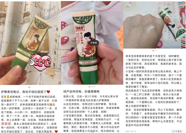 马应龙婴儿护臀膏上市近十年来,获得了众多中国爸爸、妈妈的认可和感恩回馈,还被许多优质店铺在不同的平台种草及力推。像是小红书、微博等等,这些平台都有马应龙护臀膏的踪影。
