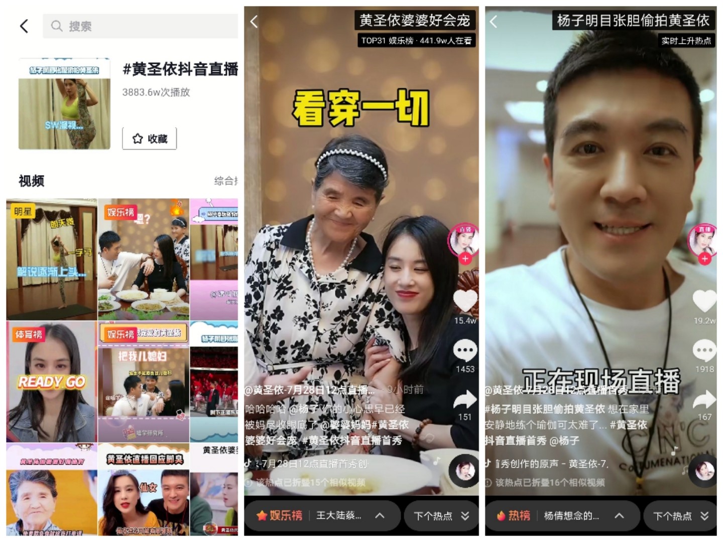 相关数据显示,整场直播总成交额超过5000万元,直播间累计观看人次高达2542.14万,平均在线人数5.69万,最高在线人数14.42万,#黄圣依婆婆好会宠、#杨子明目张胆偷拍黄圣依 等多个热点话题登录抖音热榜。黄圣依和杨子的专业讲解和搞笑互动,更是让网友直呼“恩爱”、“宠妻狂魔”、“被圈粉了”,同时,得益于人货场精准匹配,黄圣依直播首秀即取得不俗成绩,一度占据带货榜第1名。