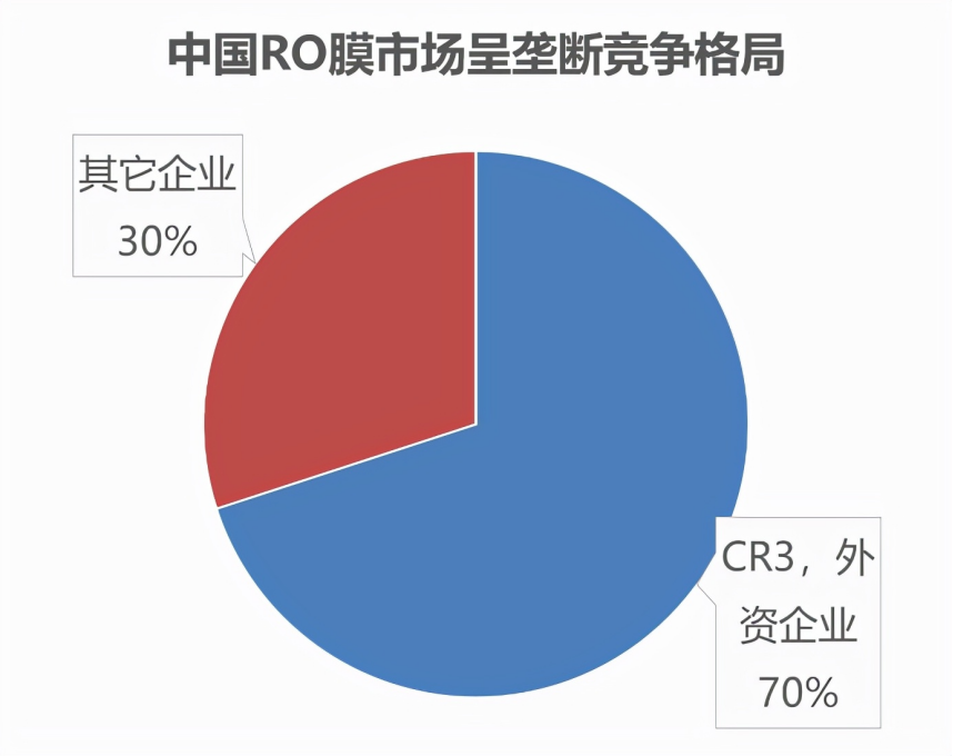 中国市场反渗透膜产品的销售总额约为全球销售总额的30%-35%,市场规模居世界首位。但反渗透膜属于寡头竞争格局,国产化率低,国外反渗透膜产品占据国内市场主导地位。据2012年国联证券研究所公布的数据显示,陶氏、日东电工-海德能、东丽三家外资巨头占据了我国反渗透膜市场的前三位,共70%以上的市场份额。