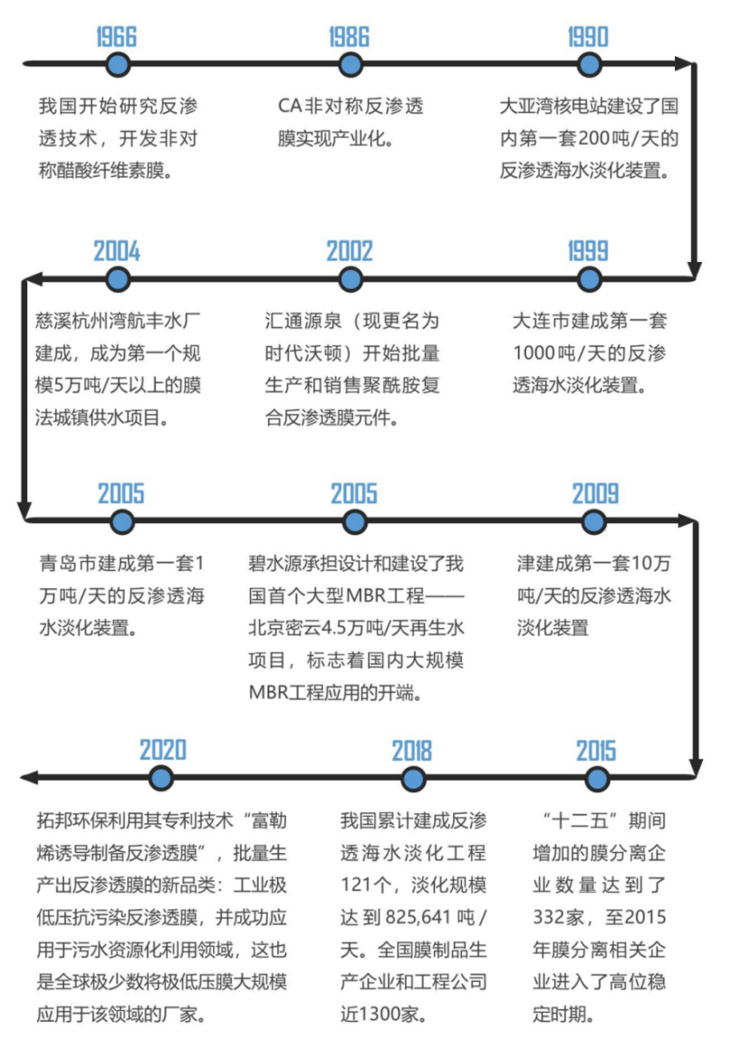 在各种膜分离技术中,反渗透技术是近年来应用最成功、发展最快、普及最广的一种。自1948年Nollet首次发现渗透现象以来,全球各国开始不断研发反渗透膜技术,到20世纪90年代出现低压反渗透复合,为第三代反渗透膜,膜性能大幅度提高,为反渗透膜技术发展开辟了广阔的前景。