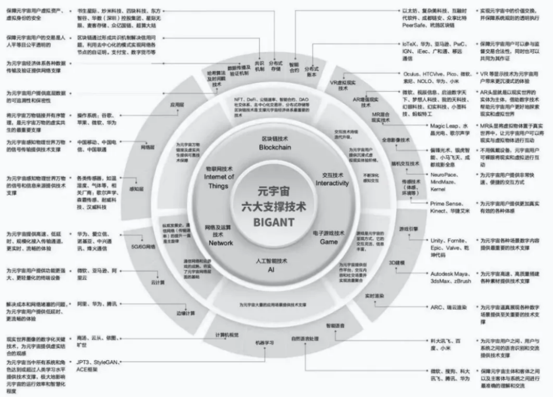 元宇宙设计者提出六大支撑技术,称为BIGANT(B是区块链Blockchain,I是Interactive交互,G是Game游戏,A是Artificialﻪ Intelligence人工智能,N是Network Computing网络计算,包含云计算和边缘计算,T是Networks of ﻪThings物联网)。