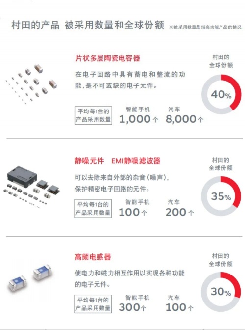 村田制作所,是一家日本企业。它的名字并不为人熟知,但产品却深入在每个人的生活中,手机、电脑、汽车无处不有。它从日本的家族企业起家,至今已有77年历史。村田制造的是电子元器件,其中片状多层陶瓷电容器、EMI静噪滤波器、高频电感器在全球的份额都达到30%以上。每一个手机、每一台汽车中都需要数百甚至数千个这样的元器件。