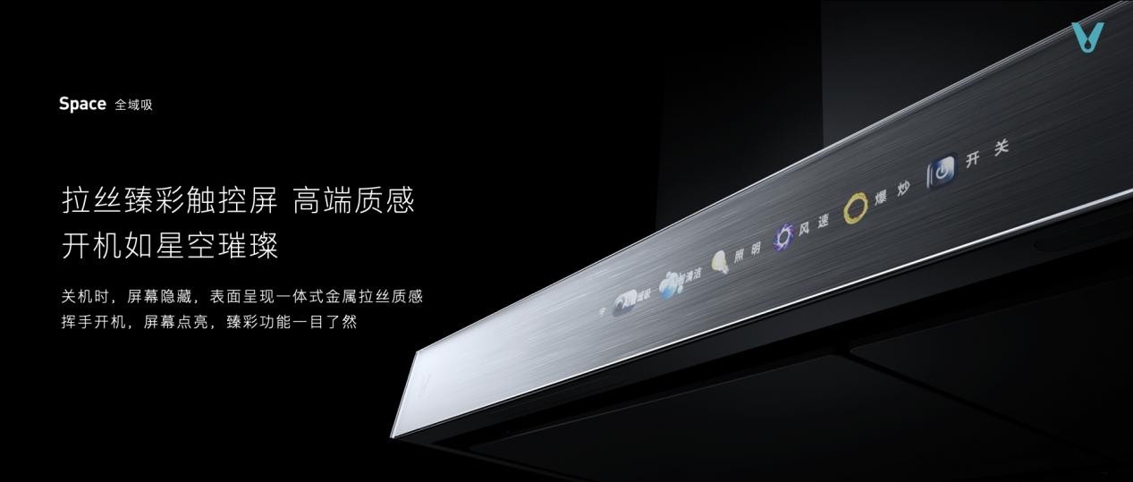 设计上,Space 云米AI智目油烟机采用拉丝臻彩触控屏,精致外形体现对美好厨房的生活追求。关机时,屏幕隐藏,表面呈现⼀体式金属拉丝质感。挥手开机,屏幕点亮,如星空璀璨,臻彩功能一目了然。