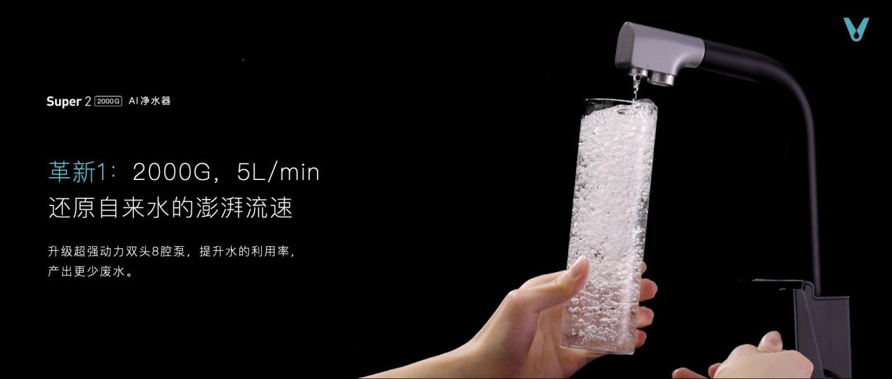 Super2 2000G云水·泉先AI净水器以2000G滂湃海量,升级超强动力双头 8 腔泵,提升水的利用率,产出更少废水,让流速时间更快:以12秒接满1L水壶;30秒接满2.5L汤壶;48秒接满4L洗菜盆的惊人速度,解决传统净水器出水量小、时间久等问题。