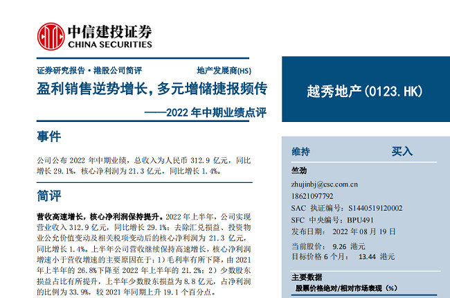 2022年8月18日,越秀地产发布2022年中期业绩报告。数据显示,越秀地产上半年实现营业收入312.9亿元,同比增长29.1%,核心净利润则同比增长1.4%至21.3亿元,成为同期内少数经营业绩保持正向增长的房企之一。在行业调整的特殊阶段,越秀地产丰硕的多元增储成果、优异的销售表现以及稳健的财务状况受到了资本市场的肯定,瑞银集团、花旗银行、星展银行、兴业证券、光大证券、中信建投证券等多家知名券商机构均对其维持“买入”评级;中金公司、海通国际则分别延续“跑赢行业”以及 “跑赢大市”的评级。
