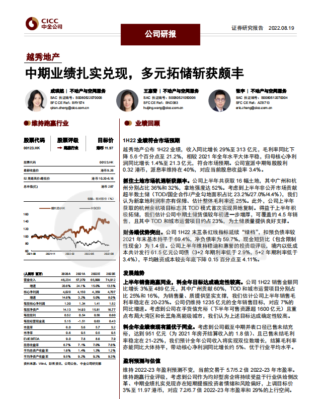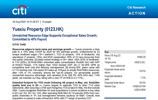 亮眼的销售表现以及优质资源的加持使越秀地产的可预期增长备受看好,花旗银行、中金公司认为越秀地产实现年度销售目标达成确定性高。中金公司在报告中指出,越秀地产上半年的已售未结充裕,全年业绩表现有望优于同业;星展银行更是预言,越秀地产将成为2022年销售增长中的领头者。