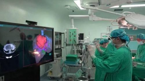 “行左三叶肝脏肿瘤切除+右后叶部分肝脏切除。手术尽管非常艰难,但有海信计算机辅助手术系统(CAS)的导航,手术安全、平稳。”董蒨教授表示。