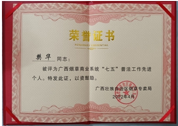 就是这样,工作23年来,樊华做过送货员、访销员、网建员、综合管理员和现在的证件管理员,她在每个岗位都刻苦钻研、任劳任怨、默默奉献;她视顾客如亲人,让人倍感亲切;她执法业务精通、效率极高、出错率为零,深得领导、同事和群众的信赖。樊华同志多次被评为“先进工作者”、政务服务工作先进个人,被南宁市局(公司)评为优秀员工和先进个人、广西烟草商业系统“七五”普法工作先进个人。