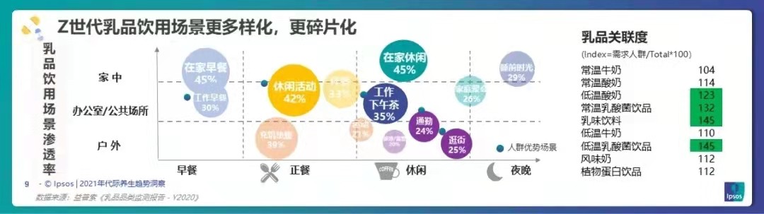 在对乳品的消费上,Z时代年轻人接触乳品的场景呈现多样化、碎片化。从早到晚,从餐点到休闲,从室内到室外……丰富的饮用场景,以及多样化的产品类型,意味着有更多的市场机会点。除早餐之外,让乳品进入年轻人的休憩时光,是企业扩展市场的重点选择之一。