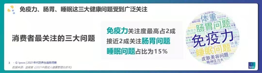 益普索调研发现,消费者对于健康的关注度一直居高不下,而其中最受关注的三大问题是免疫力、肠胃和睡眠,占比超过50%。