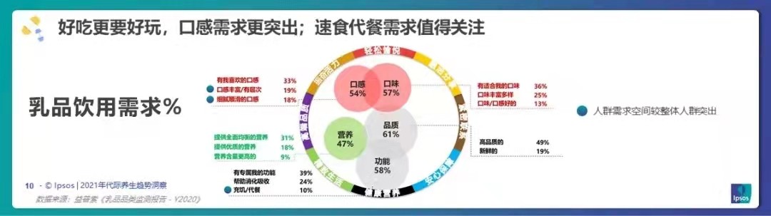 在益普索的调研中,24岁以下年轻人对乳品口感的需求,相比较其他年龄段更为突出。口感丰富、有层次的产品,更受年轻人欢迎。这意味着要打动年轻人的心,乳品企业需要在口感创新上,多下功夫。