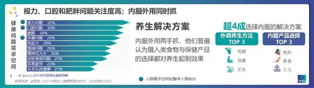 调研结果显示,Z世代年轻人更多地关注视力、口腔、肥胖等健康问题,这与当前年轻人所处的大环境以及生活习惯特点,都有必然联系。在他们看来,解决健康问题的效率必须要高,内服外用,双管齐下,才是最好。